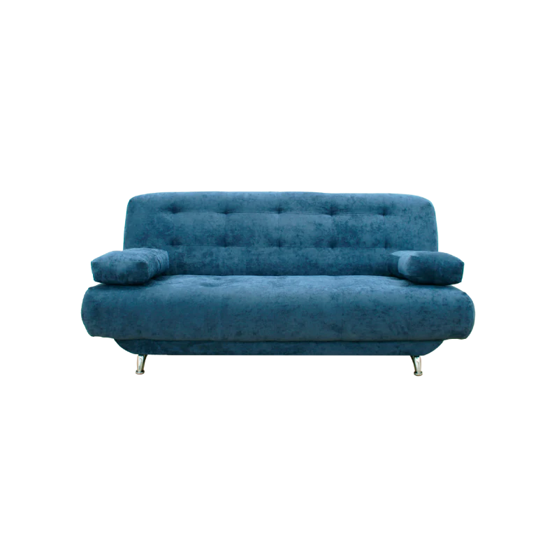 Descripción: Sofá cama de estilo contemporáneo. Superficie de cama intermedio entre colchón individual y matrimonial. Dos cojines riñoneras. Está fabricada con estructura de madera de pino, tapizada en tela 100% poliéster con apariencia y tacto de lino.
